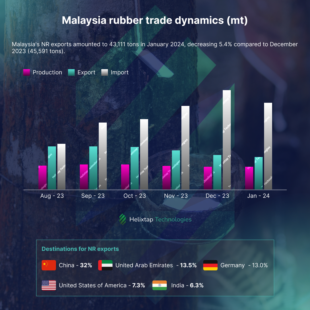 Ivory Coast continued to be a major source of rubber imports to Malaysia, accounting for over a third of total imports in January. However, overall imports decreased compared to December 2023, with Thailand and Myanmar also contributing significant shares.