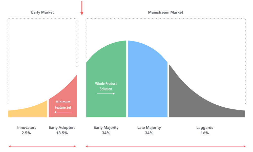 In Moore’s diagram below, the chasm is where the idea (and most startups) die. Startups were previously having decent feedback from early adopters suddenly need to make payroll or rent or if externally funded, hit specific milestones, but the rest of the market just isn’t taking to it. Lack of results, bad timing, consumers unaware of product or lack of product-market fit are all death knells, especially for undercapitalized firms.